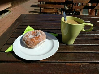 Myös koirat saa tulla. Herkulliset leivonnaiset. Pieni kirjakauppa samassa.