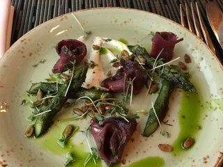 Catch of the day for a lunch, fresh delicious fish with a beetroot dip/salad. Excellent.